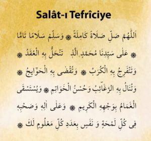 “Ey Allah’ım! Efendimiz Hazreti Muhammed’e (sav) kusursuz bir salât ve rahmet, mükemmel bir selâm ve selâmet vermeni diliyoruz. O Peygamber ki, onun hürmetine düğümler çözülür, sıkıntılar ve belalar onun hürmetine açılıp dağılır, hacet ve ihtiyaçlar onun hürmetine yerine getirilir. Maksatlara O’nun hürmetine ulaşılır, güzel sonuçlar O’nun hürmetine elde edilir. O’nun şerefli yüzü hürmetine bulutlardaki yağmur istenilir, Allah’ım, onun ehl-i beytine, ashabına da her göz kırpacak kadar zamanda (her an, saniye) her nefes alacak zamanda sana malum olan varlıklar sayısınca salât et.”